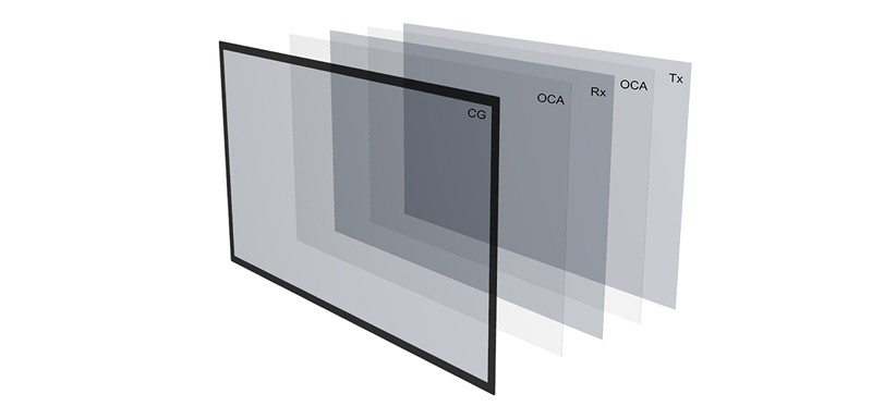 例如我司產(chǎn)品采用的是金屬網(wǎng)格GFF的貼合方式,表層是玻璃,底部是光學膠+Rx電極和光學膠+Tx電極貼合而成。