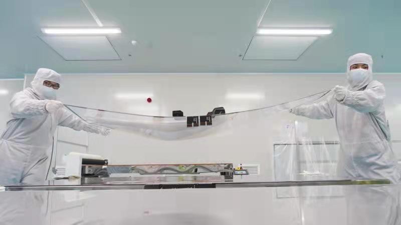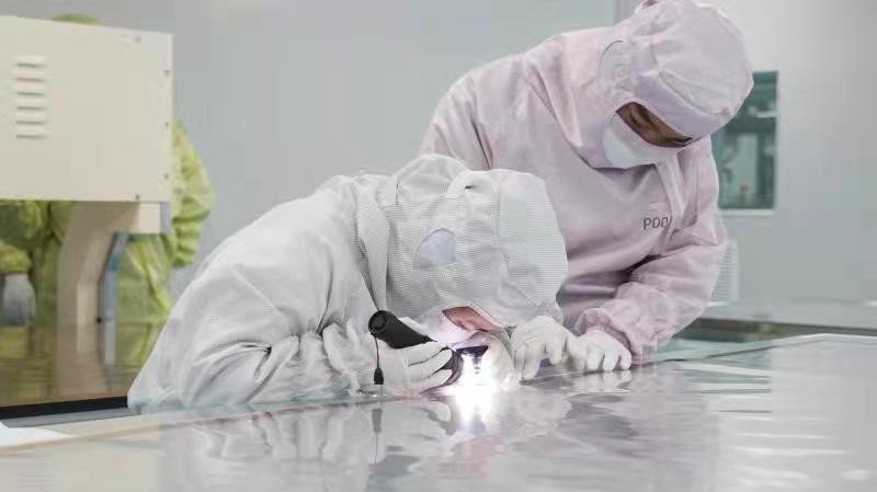 ? ? ? ? 2月9日,高新區(qū)松柏電子生產(chǎn)車間,2名工人合力將一張86寸觸摸屏移下操作平臺。
